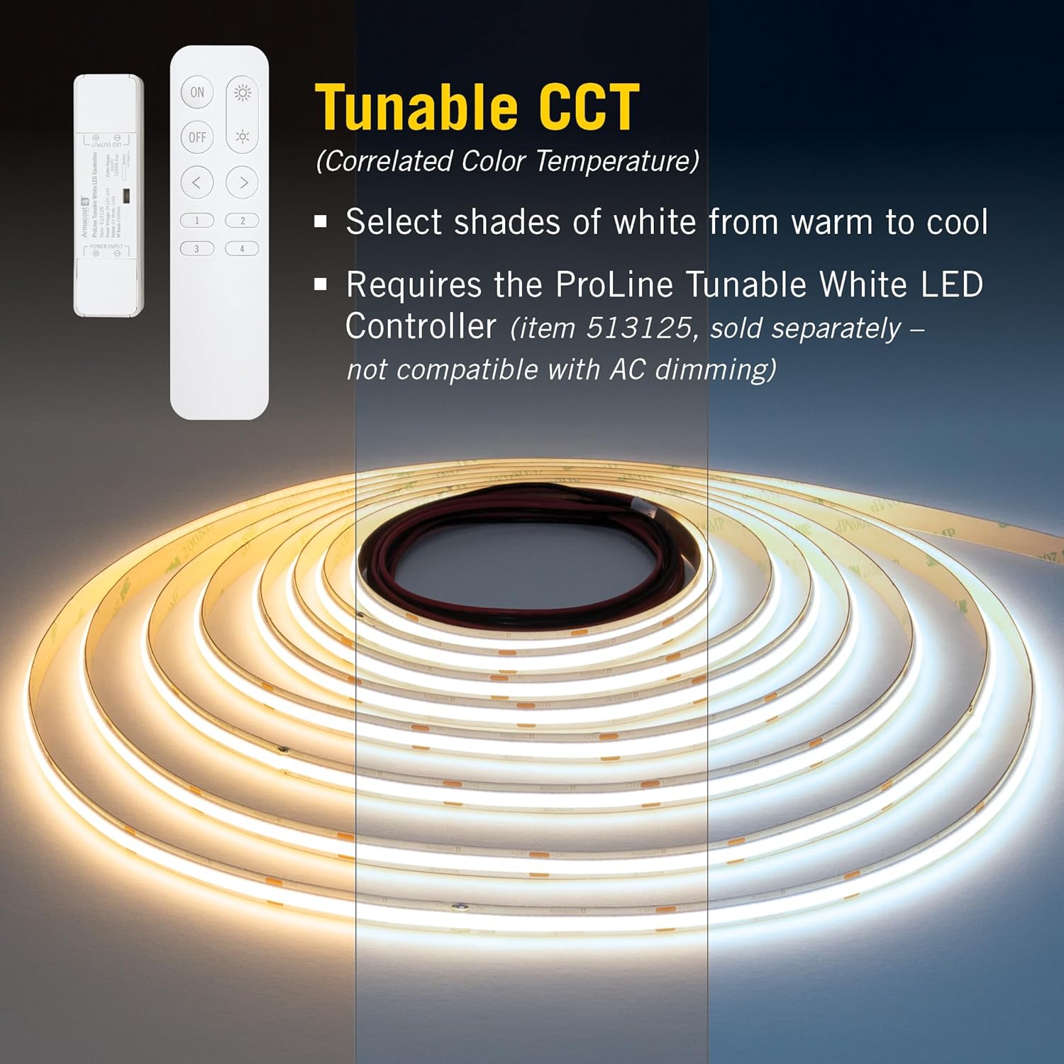 Lighting's Ribbon Flex Pro 24 Volt Tunable White Continuous LED Strip Light features both COB LED and CCT technology, making it the most adjustable and customizable accent lighting solution available. Dotless COB LED strip lights emit a continuous strip of illumination that is free of spots or breaks. CCT tunable technology provides shades of white light from a warm 2700K to a cool 5000K. With a seamless light output, this unique LED light tape is especially perfect for under cabinet lighting as it prevents visible LED dot reflections on countertops. Flexible LED strip light can be used as-is or cut to size for custom installations. 24V power supply and Lighting ProLine Tunable White LED Controller required and sold separately.