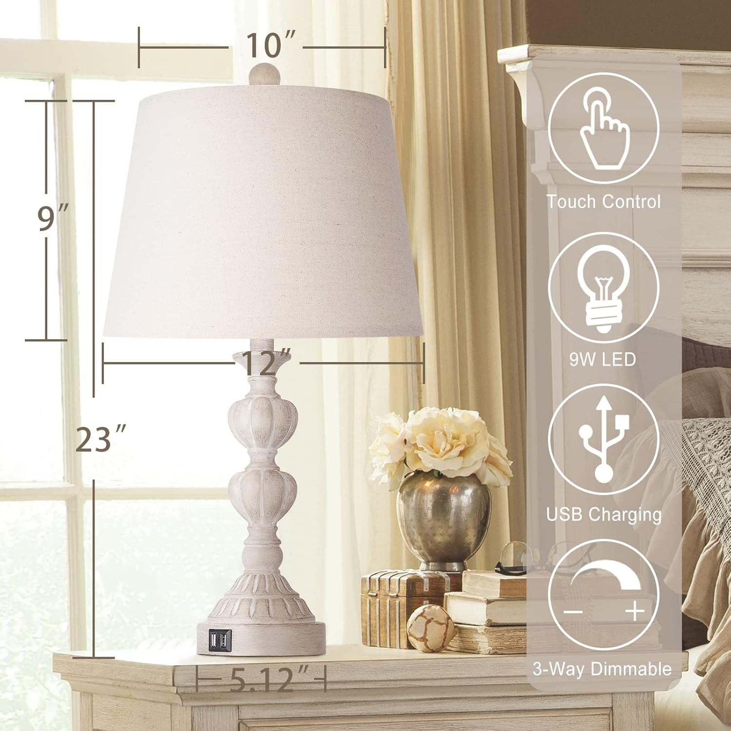 PARTPHONER Touch Control Coastal Farmhouse Table Lamp Set of 2, 3-Way Dimmable Bedside Lamp with 2 USB Charging Ports, French Country Style Nightstand Lamp for Living Room, Bedroom - Washed White
