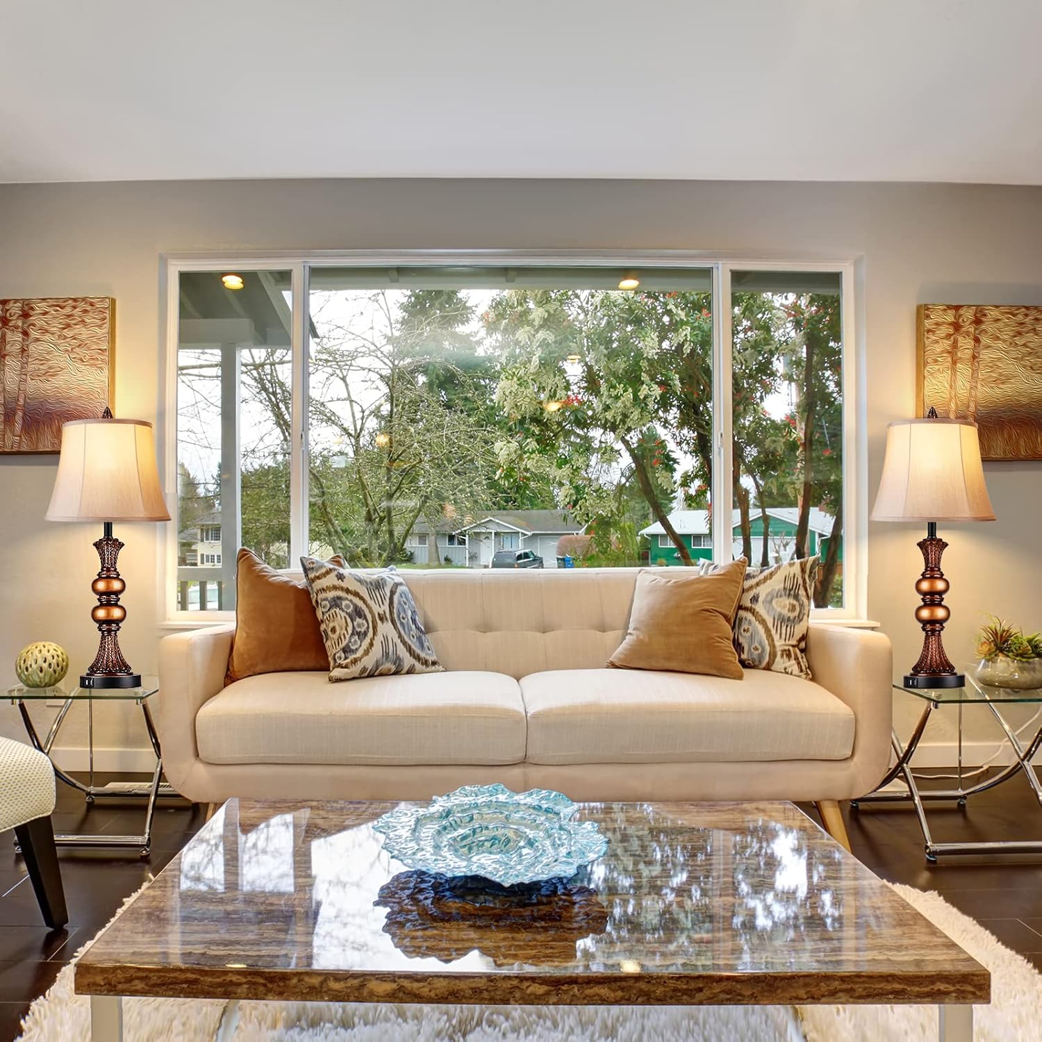 Set of 2 Touch Control Traditional Table Lamp, 27"H Bedside Lamps with 2 USB Charging Ports, 3-Way Dimmable Bronze Finish Large Nightstand Lamps with Bell Faux Silk Shade for Living Room, Bedroom