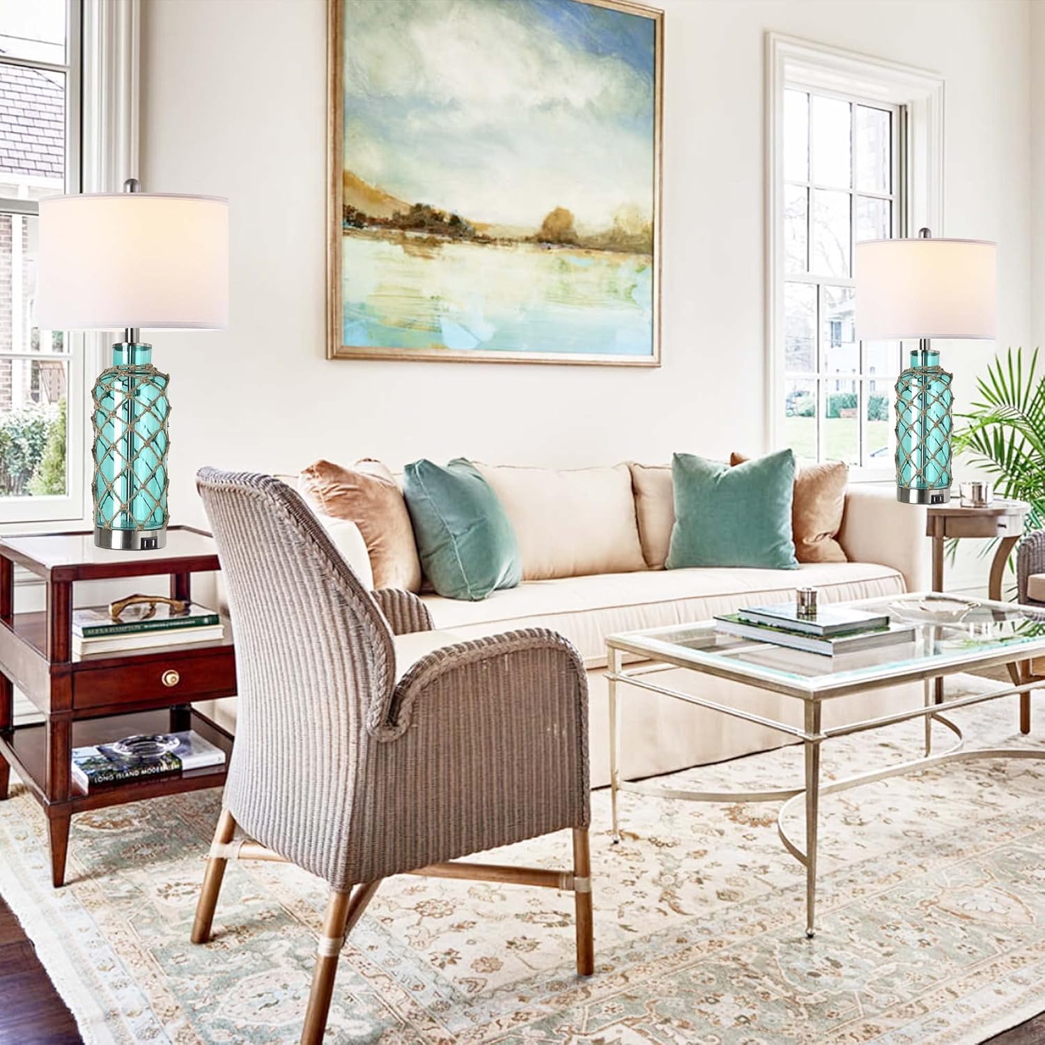 Cottage Nautical Accent Table Lamp Set of 2, Touch Control Coastal Blue Green Glass Rope Net Bedside Lamp with 2 USB Ports, 3-Way Dimmable Nightstand Lamps with White Shade for Living Room, Bedroom