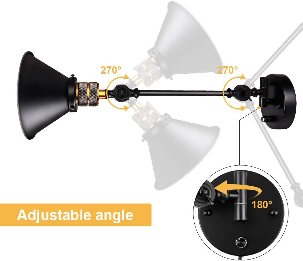 Plug in Wall Sconces Set of 2, PARTPHONER Swing Arm Wall Lamp with Dimmable On Off Switch, Metal Black Vintage Industrial Wall Mounted Lighting Reading Light Fixture for Bedside Bedroom Indoor Doorway