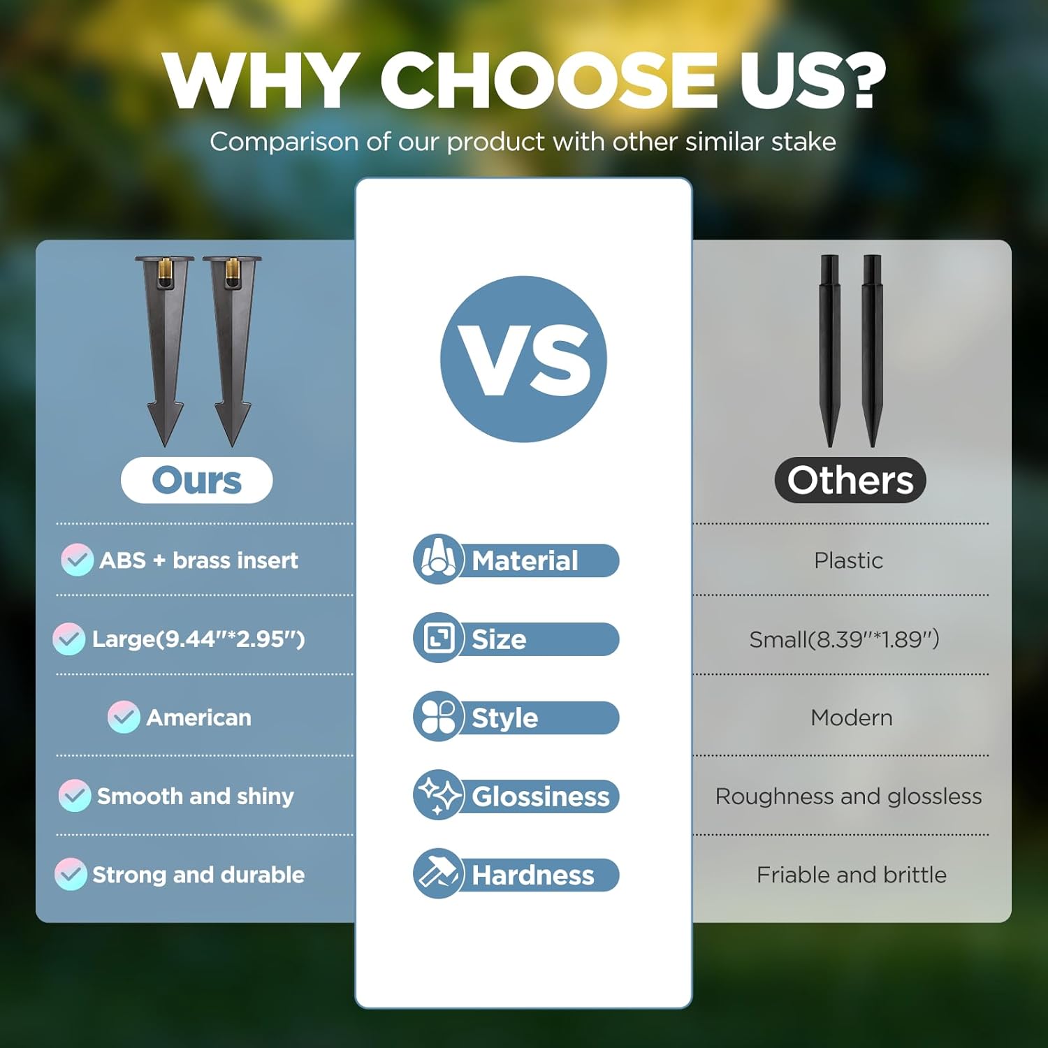 - STURDY GROUND STAKE: ABS (Acrylonitrile Butadiene Styrene) polymer + brass insert, these heavy-duty ground spikes have a 9.44-inch corrosion-resistant plastic body and 1/2 NPT brass threads for long-lasting use in harsh outdoor conditions