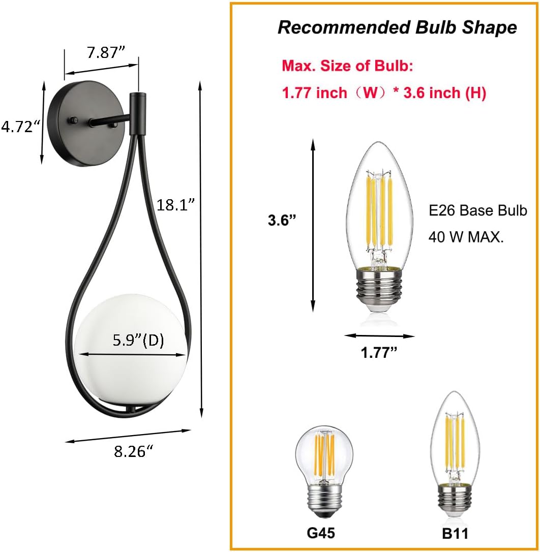 - Diameter 8.26-inches, Height 18.1-inches, Back plate 4.7-inches,Lampshade Diameter 5.9-inches.Suggestion: Before purchasing, please check the dimensions of the globe wall light.