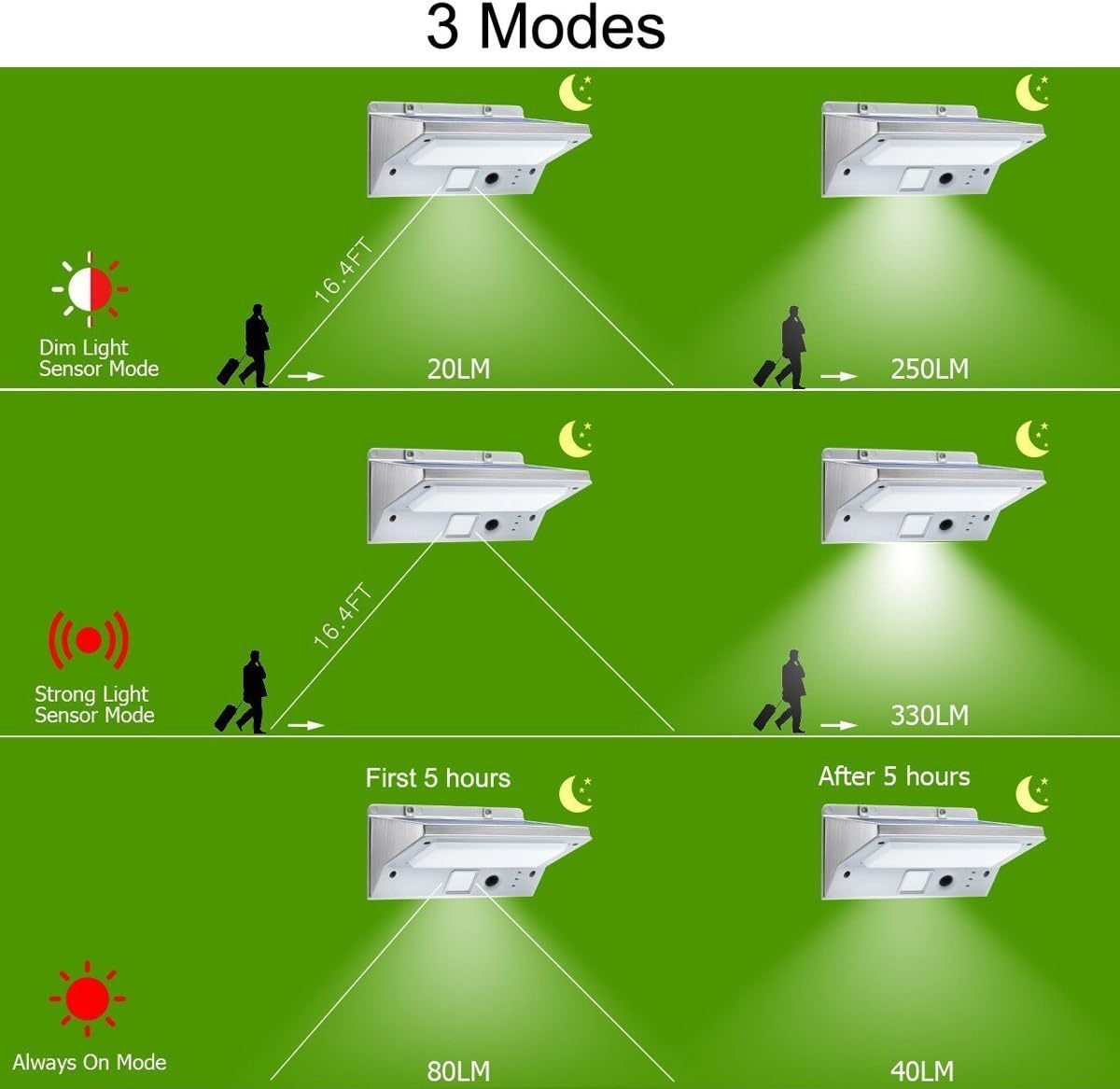 - 3 Modes Solar Motion Sensor Lights Outdoor: 1st mode: the lights will stay on dim when no motion detected and then turn on bright when motion detected; 2nd mode: Stay off when no motion detected and then turn on bright when motion detected; 3rd mode: Stay dim all night