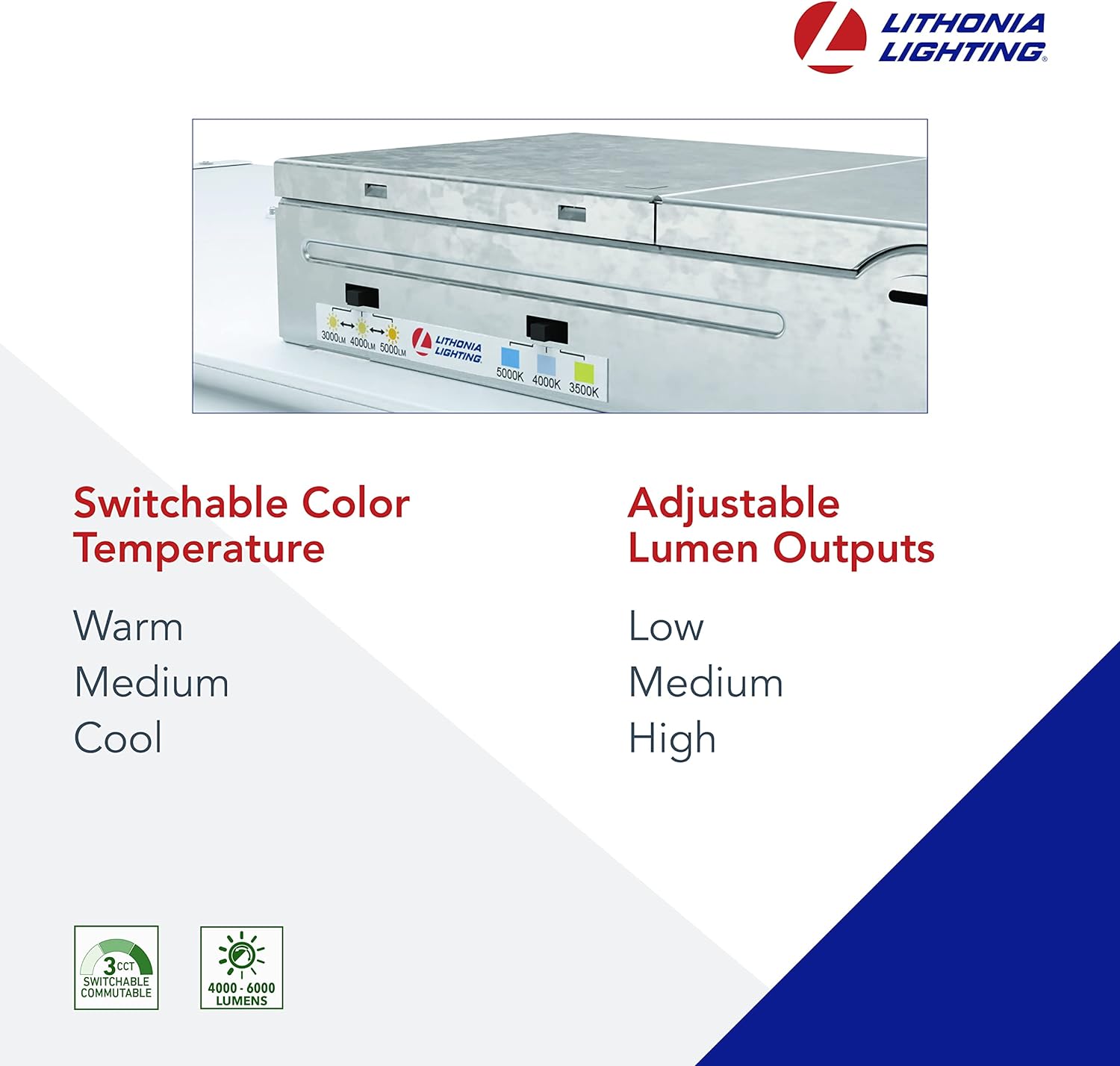 - ADDITIONAL INFORMATION: Available in 2x2 and 2x4 configurations; Comes with a 5-year limited warranty; Lumen switch options - 3000/4000/5000; Color temperature options - 3500K (Neutral)/4000K (Cool)/5000K (Daylight)
