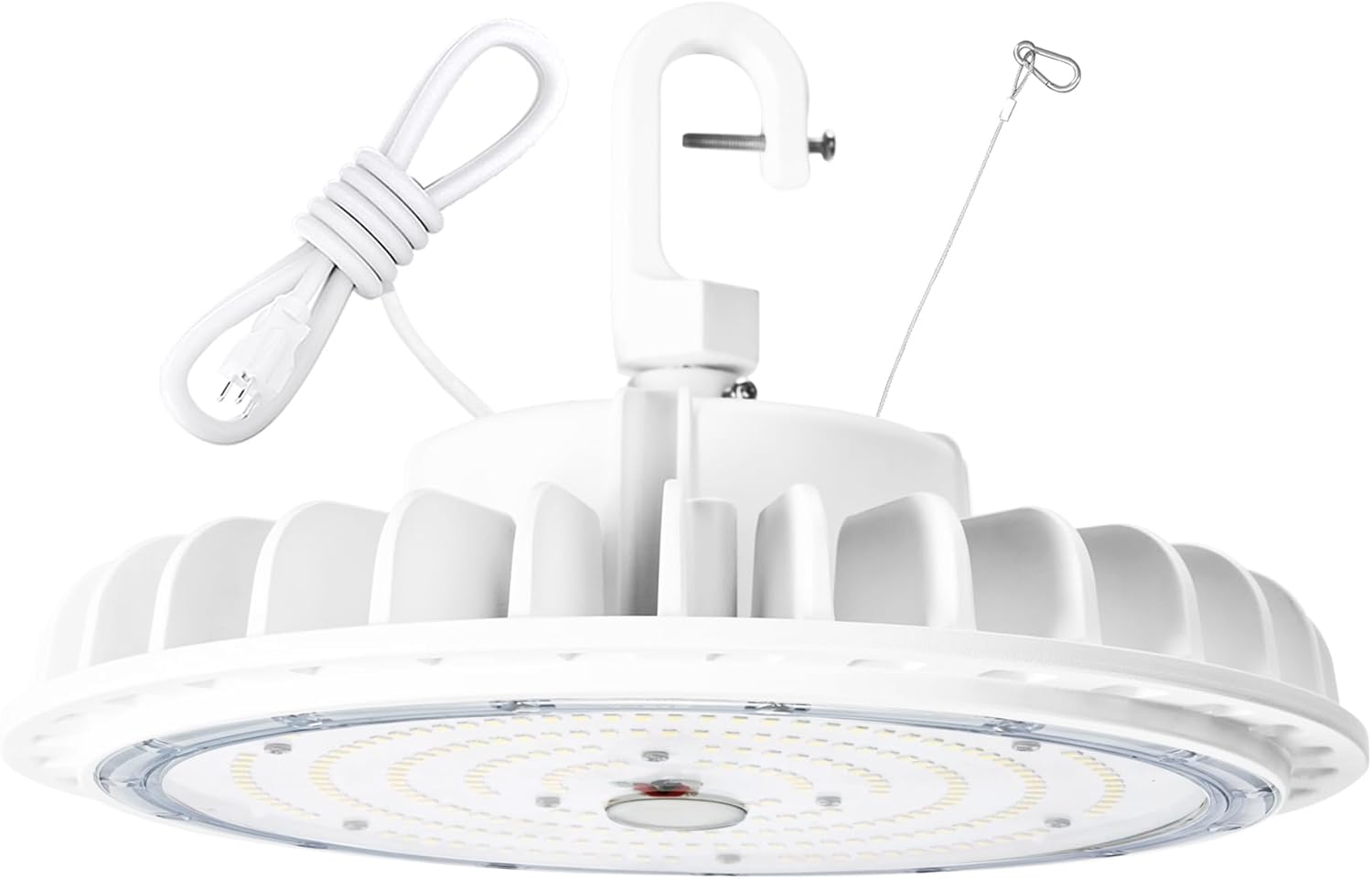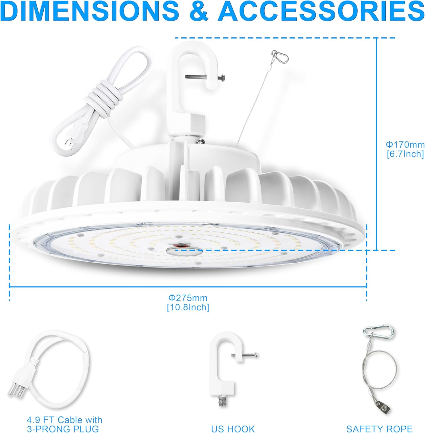 - Quick and easy installation. The high bay led lights come with a portable US hook, 5FT power cord, and safety rope to make the installation much easier. The 110VAC plug and play standard American 3-prong plug is for easy and direct power sourcing.